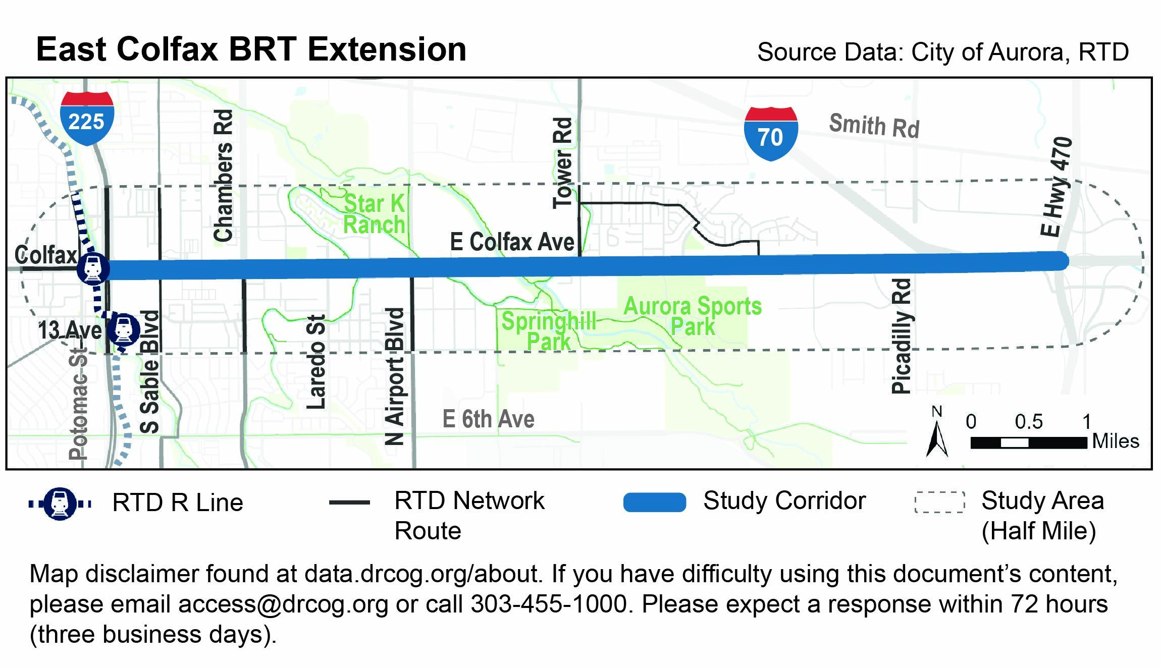 DRCOG is funding and managing the Colfax BRT Next study in partnership with the City of Aurora, Arapahoe and Adams counties, RTD, and CDOT. The study will identify future bus rapid transit, known as BRT, options serving East Colfax Avenue between the RTD R Line's Colfax Station at I-225 and Picadilly/E-470. This corridor is part of DRCOG’s 2050 Regional Transportation Plan BRT network and among five BRT corridors slated for implementation by 2030.